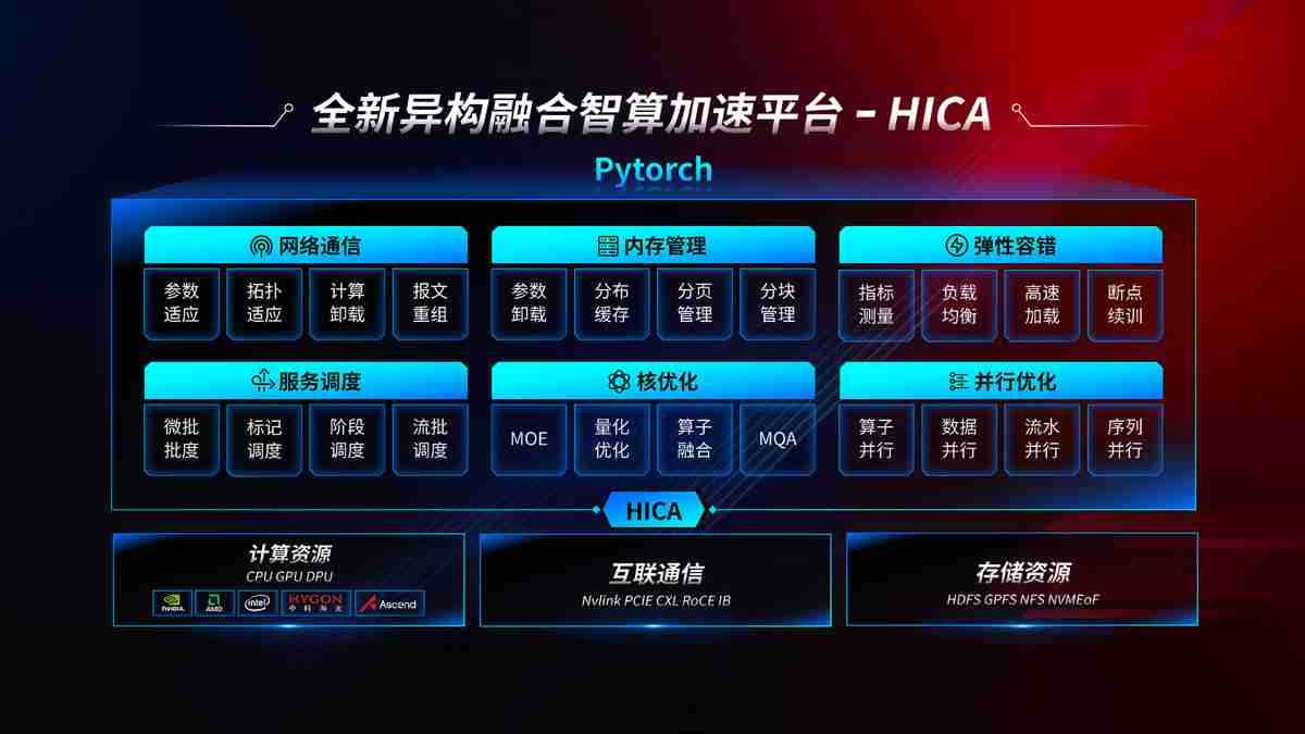 通过自研的服务层、、、中间适配层、、、、以及调度编排算法,,,采用数据并行、、模型并行等多种并行方式,,,,把并行计算任务进行有效的分解,,使其分别由相应的软件栈和算力资源来承接。。。当GPU资源变化,,,,HICA可以实时动态调度计算子任务并调整模型拓扑和架构,,,以充分聚合各种算力资源。。