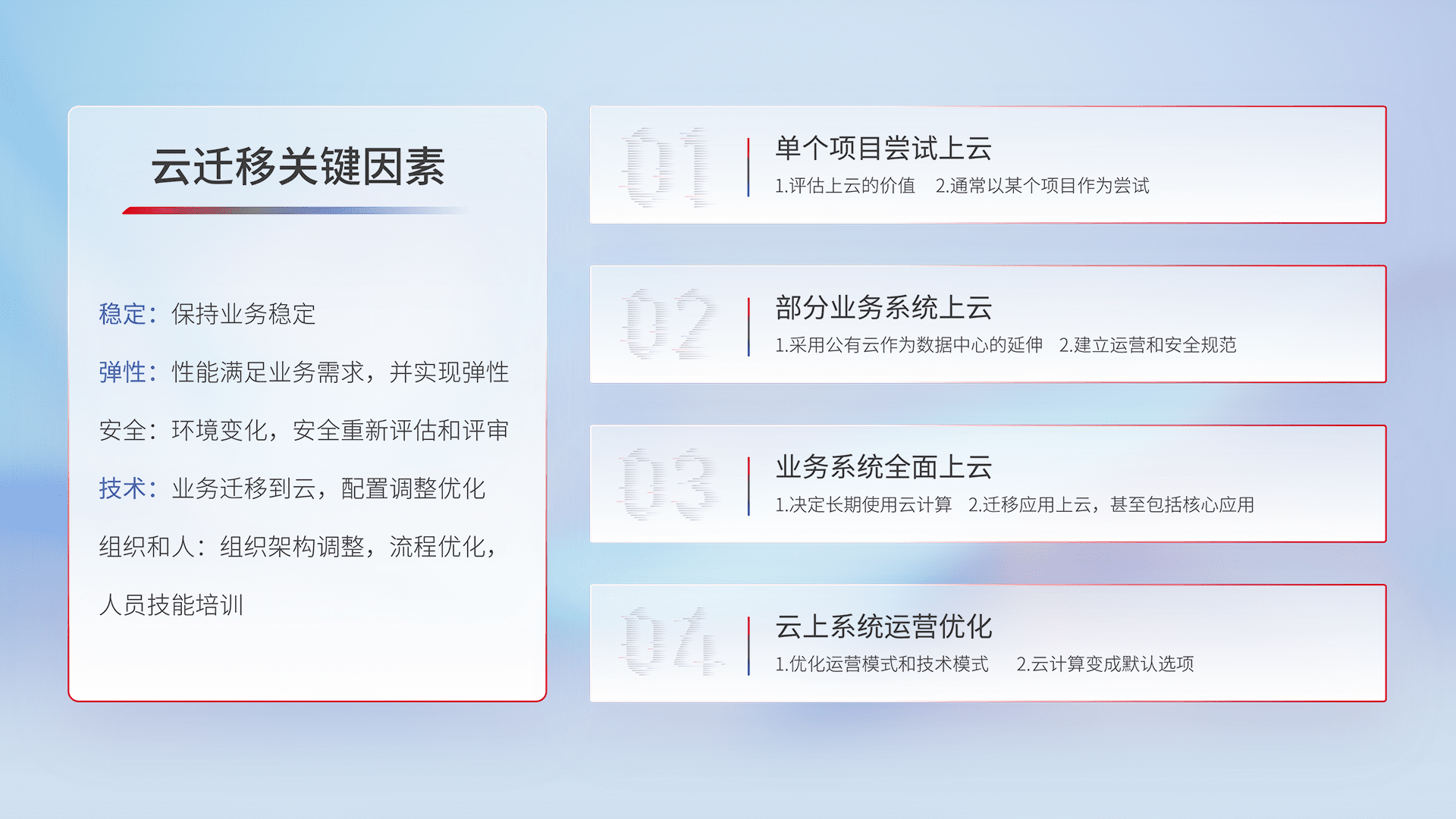 结合实际业务,,,从规划设计、、、云平台选型、、云原生改造、、、数据迁移、、、、集成交付,,,迁移全过程为客户识别最佳上云路径,,做好风险识别管理,,,设计网络架构、、、、身份权限、、安全审计合规、、、、操作审计、、、日志审计、、、、监控告警策略、、多站点容灾设计等,,对云上基础设施进行整体规划,,提升IT治理水平,,,,以满足弹性、、高可用、、、、高性能的需求。。。。