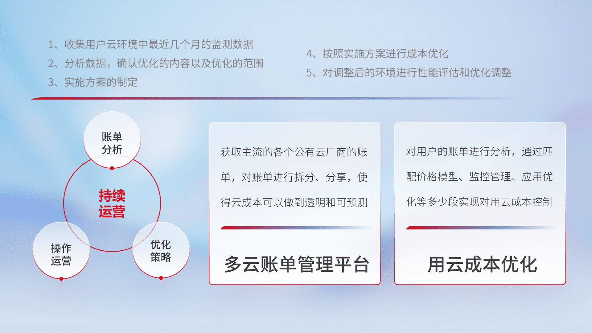 通过多云纳管,,,以统一的资源数据模型把客户的云资源进行抽象和封装,,进而实现对多云资源的统一操作,,保障云资源管理的可靠性、、、、稳定性与可用性。。量身定制化运维内容,,,配置、、、开发运维、、补丁管理、、备份、、、监控、、、、认证和访问管理、、审计和日常巡检等,,保障在用云过程中的可靠度,,,稳定度以及高可用率。。