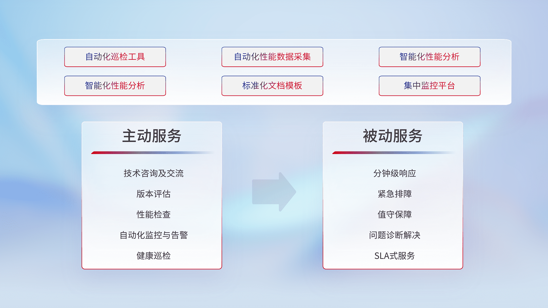 智能化工具和标准化文档,,保障服务质量,,,,提供主动服务(包含技术咨询、、、、版本评估、、性能检查、、、自动化监控与告警、、、、健康巡检)和被动服务包含(分钟级响应、、、紧急排障、、值守保障、、、、问题诊断解决、、、、SLA服务)。。。
